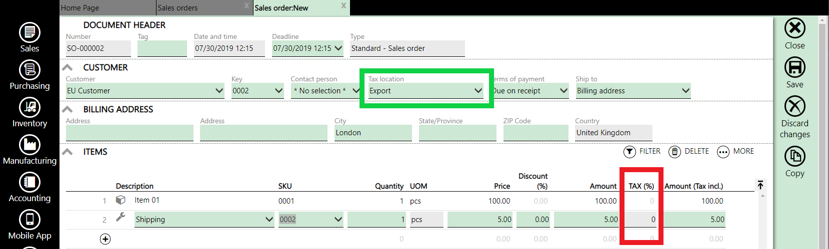 The tax location can also be defined on the customer level, so when creating a sales order, ERPAG will suggest this value. In our example, we will set "tax location" to "Export" for the "EU Customer".