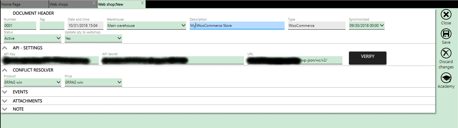 Enter the API Key, the API Password, and the URL, and then click on the VERIFY button to verify that the API data is entered correctly. When connecting to your WooCommerce, ERPAG will check whether you have correctly set up the permissions settings that you defined through the API Admin panel in WooCommerce (described in 'Preparing and Configuring WooCommerce').