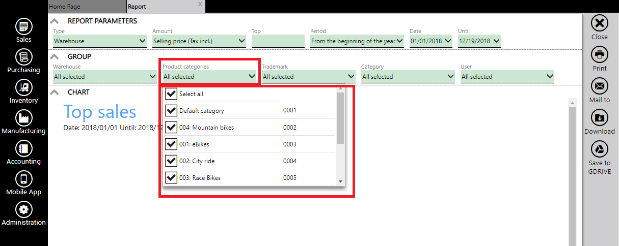 Sales > Sales by categoriesThis will open a window that will enable you to adjust the report parameters as well as categories for which you want the report to be generated.